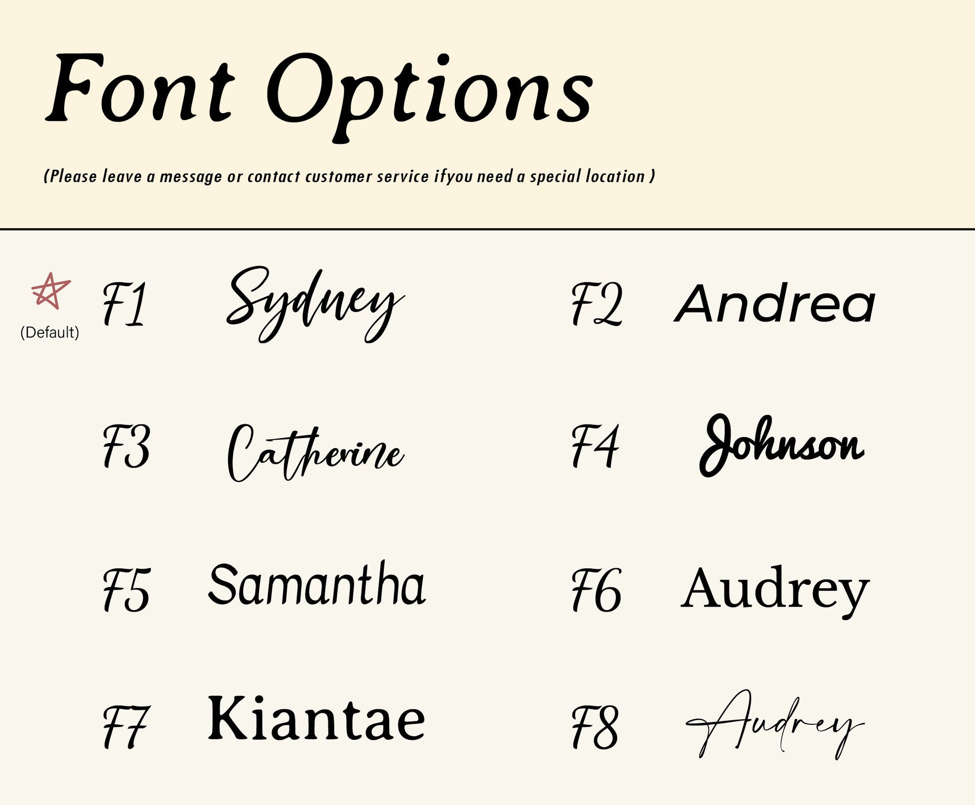 Leave the font design and name for personalization below. E.g. Lucy, F5.